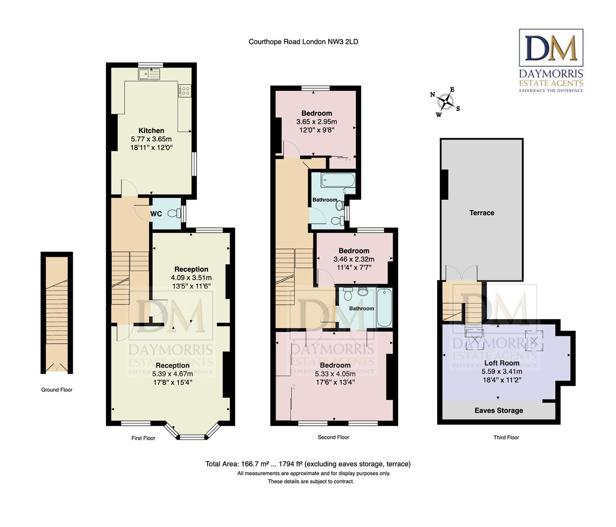 Offering just under 1800 square feet of flexible accommodation, this three/four bedroom apartment is arranged over the first, second and third floors of a Victorian house, very close to Hampstead Heath. The property is ideal for the growing family, with the first floor providing a wonderful double reception and a separate spacious kitchen. The master bedroom suite, family bathroom and two further bedrooms are located on the second floor, with the top floor loft room giving the potential for a fourth bedroom. Externally, there is a large private roof terrace at the rear. Courthope Road is one of the very desirable leafy ladder roads within the Mansfield Conservation area, and is within easy walking distance of the many shops at South End Green and the excellent transport facilites at nearby Belsize Park (Northern line) and Gospel Oak (Mildmay and Suffragette lines).